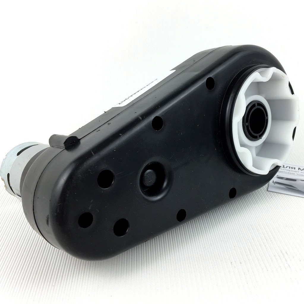 Редуктор для дитячого електромобіля з мотором RS 550 12V 12000 RPM має плоску форму та призначений для машинок, де відстань між корпусом електромобіля та колесом обмежена. Також отвір в редукторі призначений під вісь діаметром 14мм. В іншому, редуктор такий же, як і стандартні, він має три перехідні шестірні і 6-ти пелюсткову "ромашку" для кріплення до колеса. Тип двигуна редуктора - RS550 і має стандартну потужність 45 ват та у своєму резерві налічує 12000 обертів за хвилину, що дозволяє дитячому електромобілю швидко розганятися.